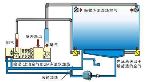 (3)泳池水加熱,熱泵除濕時回收的大量熱量絕大部分時候都能滿足游泳池水的恒溫要求,所以一般不需要輔助泳池水加熱器運(yùn)行。