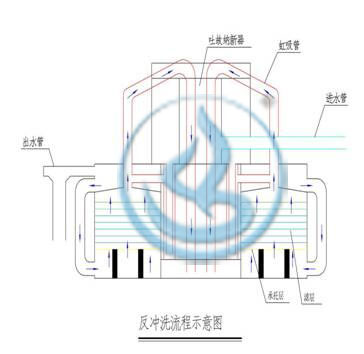 源水通過濾層,水中雜質被攔截積累起來,濾層阻力增大,造成水位上升,當水位上升到一定高度時,此時水通過一輔助虹吸管,整個系統形成自動虹吸,設備反沖洗開始,通過自動定時裝置,沖洗歷時2.5分鐘即可達到反沖洗效果。所以反沖洗工作周期取決于水質,沖洗周期可由數小時到數月。