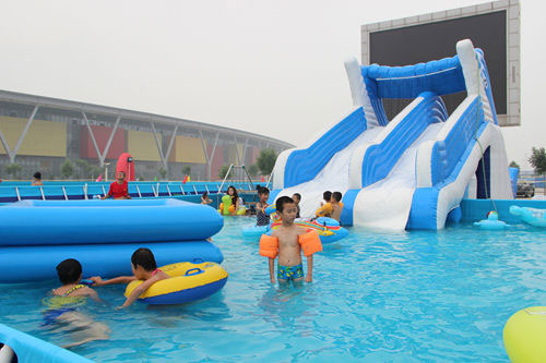 水上樂園的支架游泳池、充氣游泳池因材質(zhì)和構(gòu)造等問題,與固定基礎(chǔ)式游泳池水質(zhì)管理有些區(qū)別。環(huán)繞式布局的循環(huán)過濾凈水系統(tǒng)相對于與固定基礎(chǔ)式游泳池循環(huán)過濾凈水系統(tǒng)的水質(zhì)處理較直觀主動,但需人工輔助,而對固定基礎(chǔ)式游泳池的水質(zhì)管理較大難度。游泳池水質(zhì)處理和游泳池水質(zhì)管理是兩個近似而又所不同的概念,兩個過程是相輔相成的,兩個過程也是同時進行才能夠更好地做好。支架游泳池、充氣游泳池是使用膠膜材料生產(chǎn)的,一般選用淺蘭色材質(zhì)布料作底,水質(zhì)好的時候清澈可見池底細物,而且水面上泛影著亮瑩瑩淺蘭色波光,讓游客特別是小朋友產(chǎn)生無限的激情與沖動。游客入池游玩時,軟質(zhì)的膠膜布給腳底部一種干凈而舒適的觸覺感,所以膠膜池的顏色與材質(zhì)因素,就給了游客在視覺觸覺上一種非常好的感覺。讓游客及小朋友感覺不僅是游泳,更是一種水上游樂的新體驗。也正是由于顏色與材質(zhì)因素,水質(zhì)的變化通過池體本身也會無形反饋給游客。