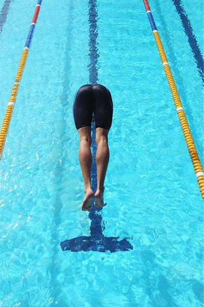 水深大于1.8米。有8個泳道,每道寬2.5米,邊道另加0.5米,兩泳道間有分道線,分道線用浮標線分掛在池壁兩端,池壁內設掛線勾,池底和池端壁應設泳道中心線,為黑色標志線。出發臺應居中設在每泳道中心線上,臺面50厘米×50厘米。臺面臨水面前緣應高出水面50至70厘米,臺面傾向水面不應超過10度。