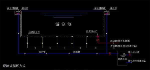 逆流式水循環(huán)方式是指泳池的全部循環(huán)水,經(jīng)設(shè)在池底的給水口或給水槽送入游泳池內(nèi),再由池壁外側(cè)的溢流槽溢流取回,進(jìn)行水處理后再送回池內(nèi)繼續(xù)使用的水流組織方式。