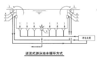 逆流式循環(huán)即泳池內(nèi)的全部循環(huán)水量經(jīng)設(shè)在池底的給水口或給水槽送入池內(nèi),再經(jīng)設(shè)在池壁的溢水槽取回使用過的相應(yīng)體積的水,進行凈化(加藥、過濾、加熱及消毒)后再送回池內(nèi)繼續(xù)使用的水流方式。