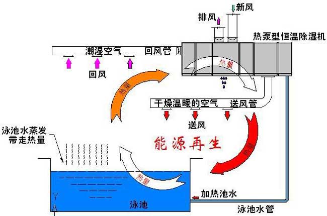 由于上面提到的這些問題,目前在市面上興起很多專門針對室內泳池開發(fā)的恒溫恒濕熱泵。一種為常規(guī)的空氣源熱泵,只提供池水的加熱,還有一種能將除濕、空調、加熱等功能集合于一體,其工作原理簡言之,即是將池水表面蒸發(fā)熱損(包括濕熱和潛熱)回收利用,轉移入池水和空氣中,彌補池水和空氣熱損,同時實現空氣調節(jié)除濕功能,當春秋的過渡季節(jié)時,(空氣溫度在15℃~26℃,相對濕度小于60%),設備運行全新風模式,此時,只有熱泵的通風機在工作,這種狀態(tài)下,熱泵的技能優(yōu)勢是顯而易見的。但在冬季,除濕熱泵的運用卻面臨制熱不足的問題。