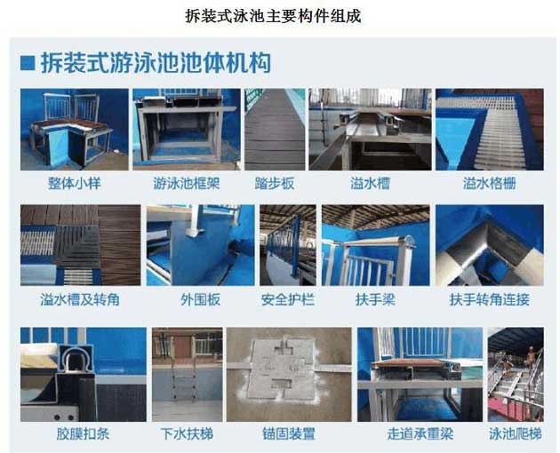 拆裝式游泳池又稱(chēng)活動(dòng)泳池或拼裝式游泳池、拼裝泳池;也是近些年市場(chǎng)涌現(xiàn)出的一種新型游泳池產(chǎn)品。其原理是在工廠(chǎng)完成所有標(biāo)準(zhǔn)構(gòu)件的定制生產(chǎn)、采用現(xiàn)場(chǎng)拼裝作業(yè)方式完成各種規(guī)格游泳池設(shè)施的組裝建設(shè)。拆裝式游泳池可以根據(jù)用戶(hù)使用需求快速安裝于大多數(shù)符合要求的簡(jiǎn)單平整場(chǎng)地、相對(duì)于普通土建游泳池而言具有顯著的場(chǎng)地適應(yīng)性和反復(fù)安裝拆卸特性,故命名為拆裝式游泳池。按照國(guó)家標(biāo)準(zhǔn),拆裝式游泳池應(yīng)該能夠提供普通游泳場(chǎng)館的所有訓(xùn)練與比賽功能要求。
