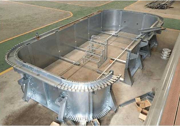 拆裝式泳池是由池體和游泳池水處理系統(tǒng)兩部分組成。池體由鋼架主體結(jié)構(gòu)、內(nèi)壁承壓防水、外壁裝飾、圍池過(guò)道、四周護(hù)欄等幾部分組成。一般拆裝式泳池池體的鋼構(gòu)采用Q-235型熱軋鋼框架結(jié)構(gòu),以高強(qiáng)度螺栓連接,鏈接螺栓為8.8級(jí),M-14。鋼結(jié)構(gòu)框架、鋼結(jié)構(gòu)溢水槽經(jīng)過(guò)鍍鋅防腐處理,表層還有兩層防腐處理,一層防銹,二層防腐。溢水槽上方一般鋪設(shè)溢水格柵,常用寬度規(guī)格有250mm、300mm、400mm等幾種,可根據(jù)不同需要進(jìn)行選擇。內(nèi)壁承壓板一般為300mm*30mm、單皮厚度為2.5mm的PVC中空板材或者1.5mm的鍍鋁鋅鋼板,泳池防水層厚度為1.2mm的具有抗拉加強(qiáng)筋的進(jìn)口泳池專(zhuān)用膠膜組成,且膠膜采用高頻焊接制作。外壁裝飾和圍池過(guò)道均由優(yōu)質(zhì)pvc材料制作而成,美觀(guān)耐用。四周護(hù)欄采用不銹鋼或者碳鋼噴涂材料制成。泳池水處理系統(tǒng)根據(jù)泳池蓄水量配置,處理效果可達(dá)到《國(guó)際泳聯(lián)(FINA)游泳池水質(zhì)衛(wèi)生標(biāo)準(zhǔn)》。