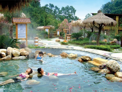 只一會兒,全身泡得通紅,寒氣頓消。被隔壁池中得笑鬧聲吸引了過去,這是一個很大的溫泉游泳池,泉水從假山頂上向下傾瀉,形成一簾漂亮的瀑布,熱氣蒸騰彌漫,水氣在道邊的樹葉上凝結成水珠向下滴落,池中的浴客很多,有的在里面游泳,潑水笑鬧,在池子的一邊配有水流按摩椅,走過去,將身體躺在上面,讓池底涌出的水流沖擊身體,就像無數個小拳頭輕重適度地敲擊著身體各部,一天來的疲憊頓消,舒服的感覺一時無法言表。池子的另一邊裝有幾個高高的水噴頭,泉水從噴頭中噴入池中,有幾個浴客站在水流下,接受流水的沖擊,一會頸部,一會背部,一會腰部,說是對治療頸椎、腰椎病效果很好。女浴客多是躺在按摩椅上,享受水流的輕度按摩,瞇著眼睛,像是睡在搖籃中的嬰兒,正沉醉在母親輕輕的搖動中。