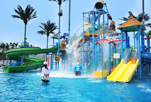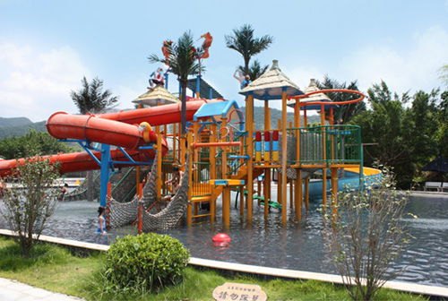 水上樂園設備:水寨是以加勒比海盜為主題的中型互動水上城堡,占地面積約400平方米,高9米,5道滑梯,1個中型翻桶。