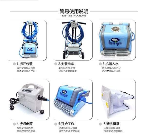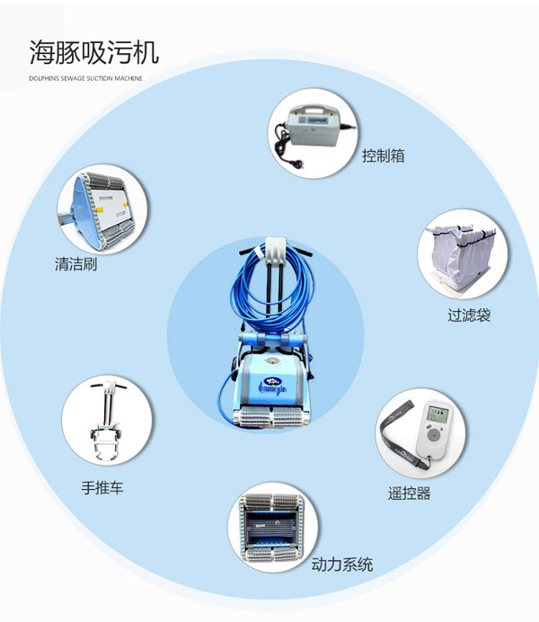 海豚2002全自動泳池吸污機采用帶過濾功能的吸污過濾袋,自動程式化工作,適用不同大小的泳池使用。休積細小,輕巧及操作容易。帶推車,便于使用及收藏。獨立設備,無需安裝。