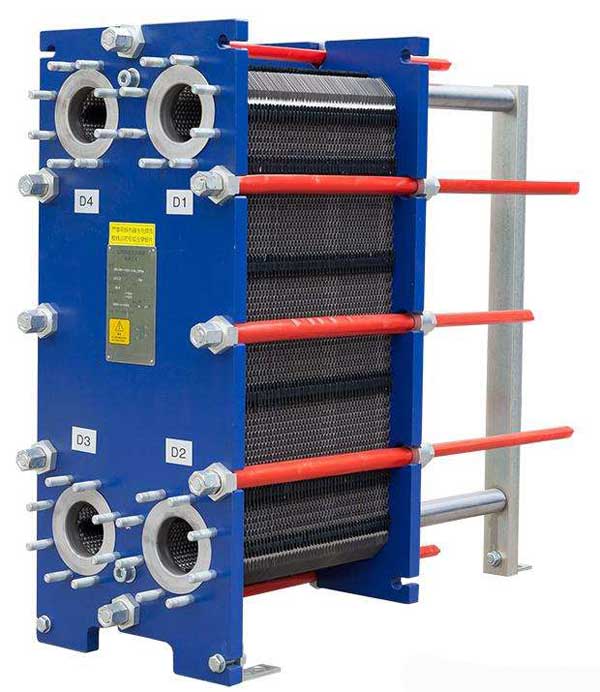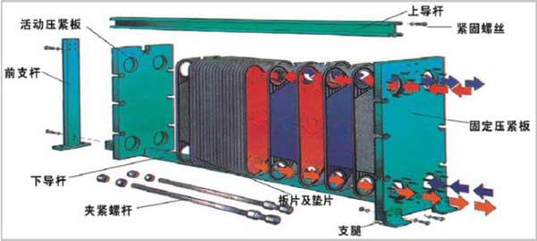 板式換熱器是由一組波紋形的平行金屬板構(gòu)成的,在板片的4個(gè)拐角出都有通道孔,板被夾緊在一個(gè)富有連接管的固定板和活動(dòng)壓緊板的框架中,并用夾緊螺栓加以夾緊。這些鏈接管同板上的通道孔對(duì)中,并與熱交換的兩種液體的外部管理相連,傳熱板和活動(dòng)壓緊板懸掛在頂部承載梁的下面并由底部橫梁使其對(duì)準(zhǔn)定位。傳熱板本身是有器有特定形狀并被固緊的電熱片密封,以防止外部泄露,并把熱交換的兩種液體按逆流方式交替地流過另一對(duì)傳熱板之間的通道內(nèi)。板片上的波紋不但提高流體的串流程度,并且形成許多接觸點(diǎn),以承受正常的運(yùn)行壓力。
